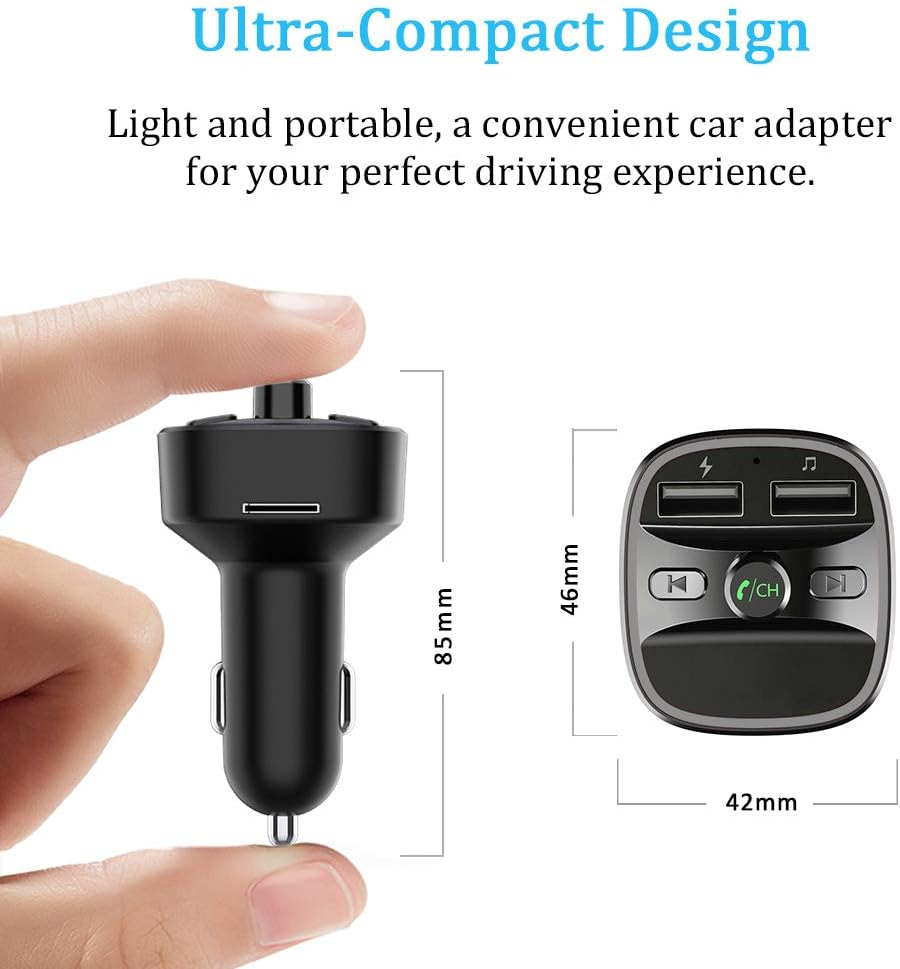 Simple and compact designed Vproof’s Bluetooth FM Transmitter comes with 2 USB ports with dedicated power outputs. The first port gives 5V 2.4A charge output, and another one gives 5V 1A. Either you can charge two devices at the same time or play music via USB or do both something else simultaneously. If you want a device that seamlessly switches between your streaming music track to your incoming calls, then this FM Transmitter fits in our liking totally.